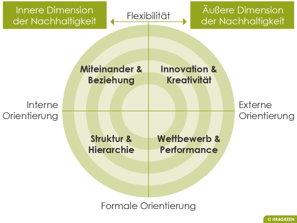 Wenn das Ziel und die Herausforderungen annähernd korrekt beschrieben sind, dann kann die Förderung von Umwelt- und Klimaschutz nicht die Aufgabe einzelner Rollen innerhalb eines Unternehmens sein (wie z.B. die Sustainability Manager:innen). Rollen steuern bestenfalls einen Prozess, der inhaltlich jedoch von allen Mitarbeitenden und jeder Abteilung mit Leben gefüllt wird, sprich: Jeder Job hat zumindest anteilig Aufgaben im Umwelt- und Klimaschutz. Dieser Wandel ist zwar umfassend, jedoch kein Hexenwerk. Ein guter Einstieg kann dabei gelingen, wenn Unternehmen auf bereits etablierte Unternehmenswerte Bezug nehmen und diese im Kontext von Umwelt- und Klimaschutz neu denken bzw. erweitern. Wie das aussehen kann, zeigen wir ihnen hier anhand des Modells »Competing Values Framework« (CVF)